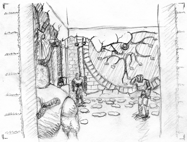 Below are excerpts from the scenario, each illustrated by sketches or screenshots directly from the realtime rendering. Screenshots are not final, as wall fracture, physics and some